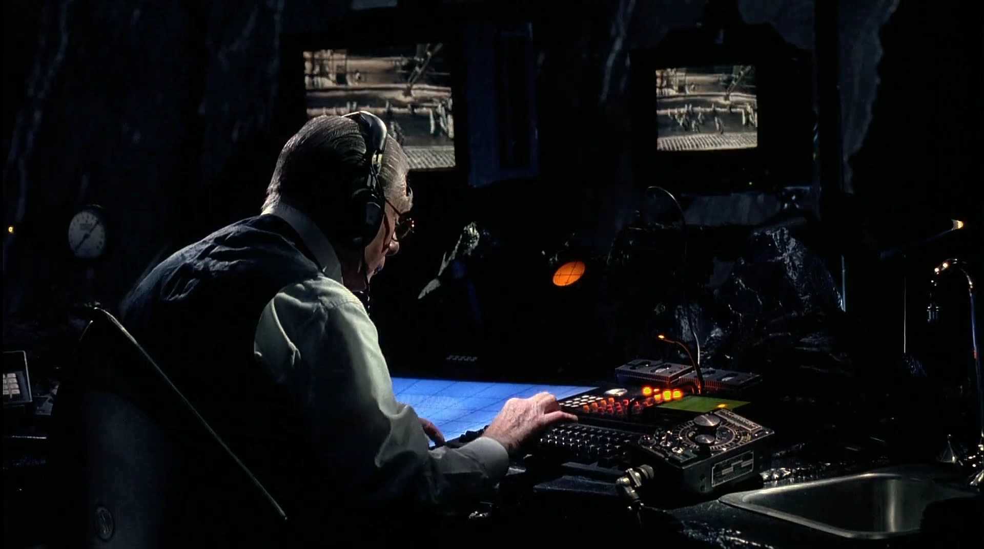 The third setup was the first to have a main monitor behind a large Batemblem in the Batcave. Bruce used the smaller monitors on the control console to watch Chase Meridian flutter her hair in slow motion during this time.